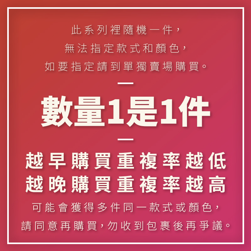 親愛的購買者請留意,若您【一次購買多件商品】,會出現重複的情況,請在下單前仔細確認。即便您留言請求避免重複,我們仍會依照系統的出貨安排進行配送。 🎁【驚喜盲盒】的定義就是隨機出貨。